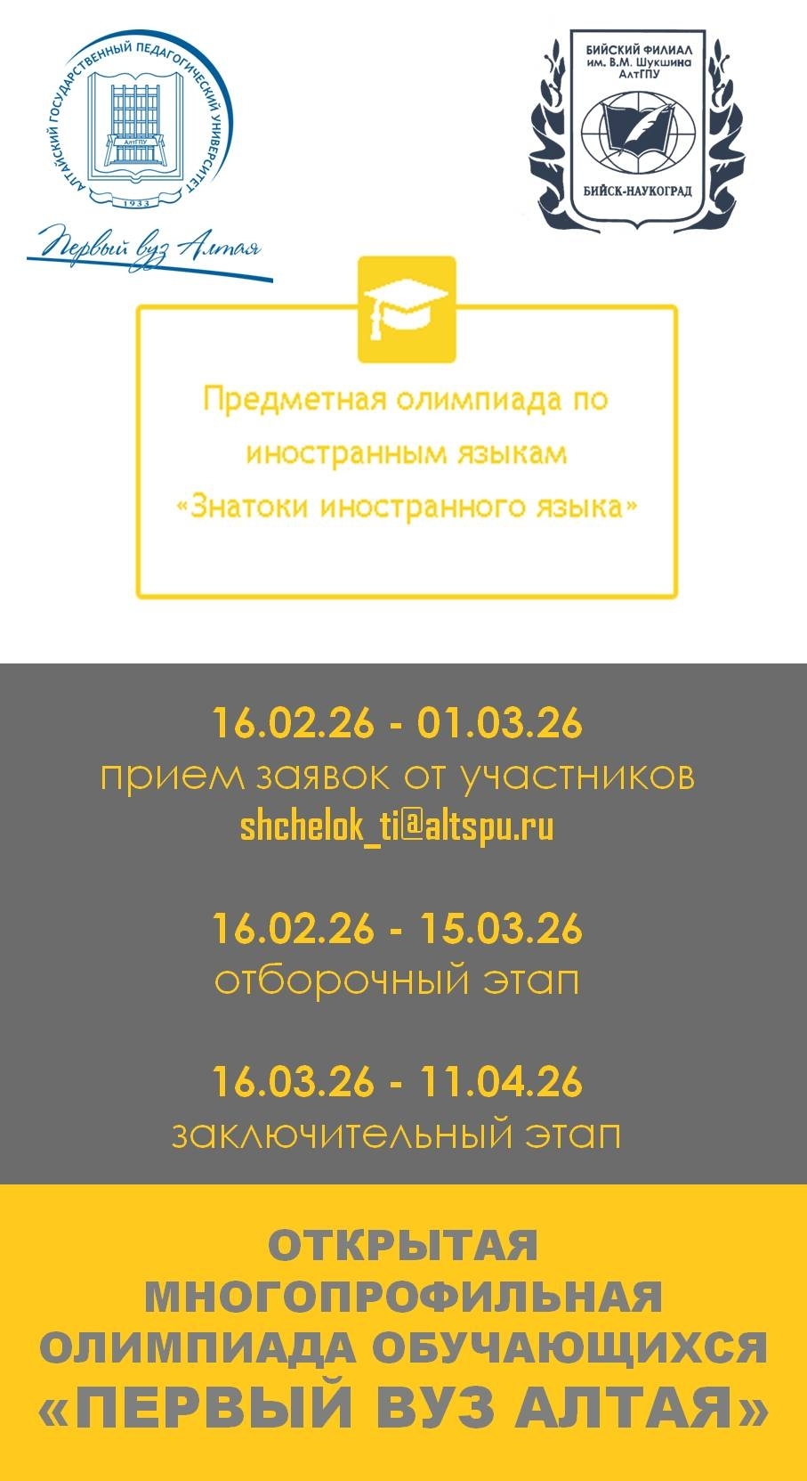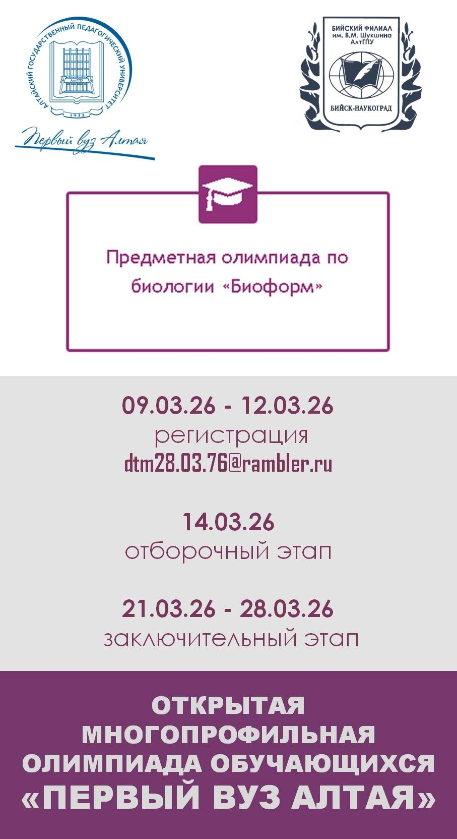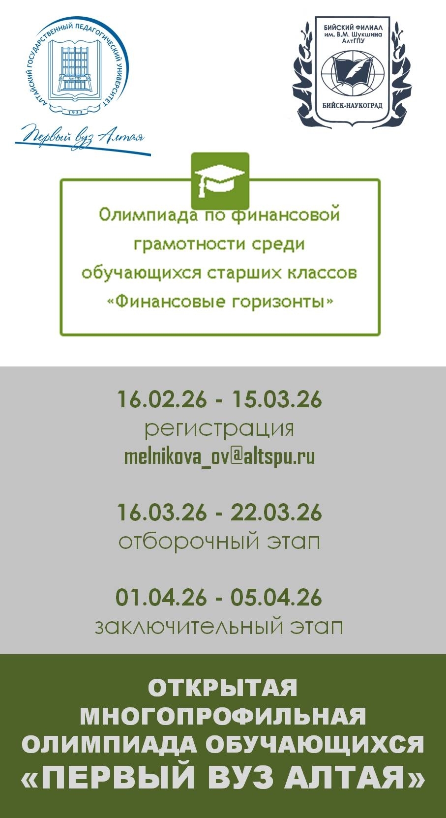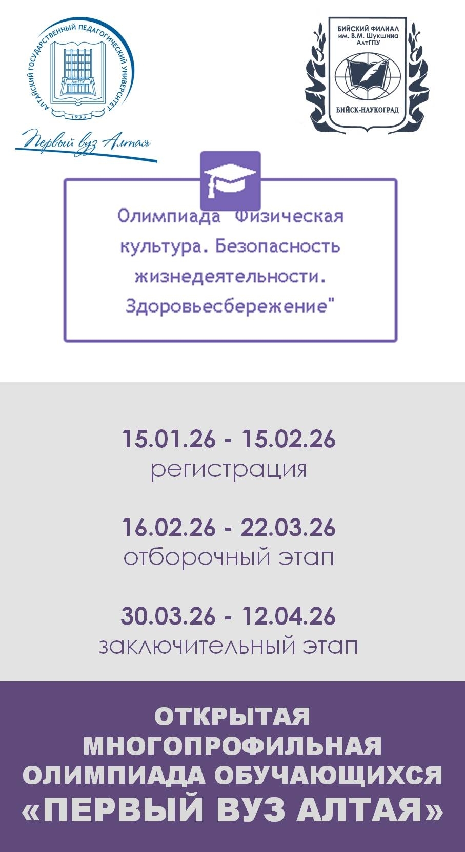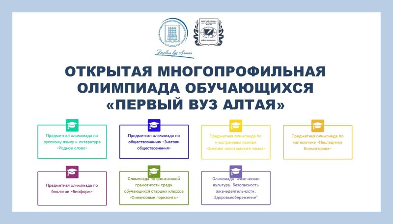 Уважаемые старшеклассники! Приглашаем вас принять участие в открытой многопрофильной олимпиаде «Первый вуз Алтая». Это уникальное интеллектуальное соревнование, объединяющее различные направления знаний и компетенций! Открытая многопрофильная олимпиада «Первый вуз Алтая» дает возможность проявить себя, получить сертификаты и призы, а также узнать больше о поступлении в наш вуз!