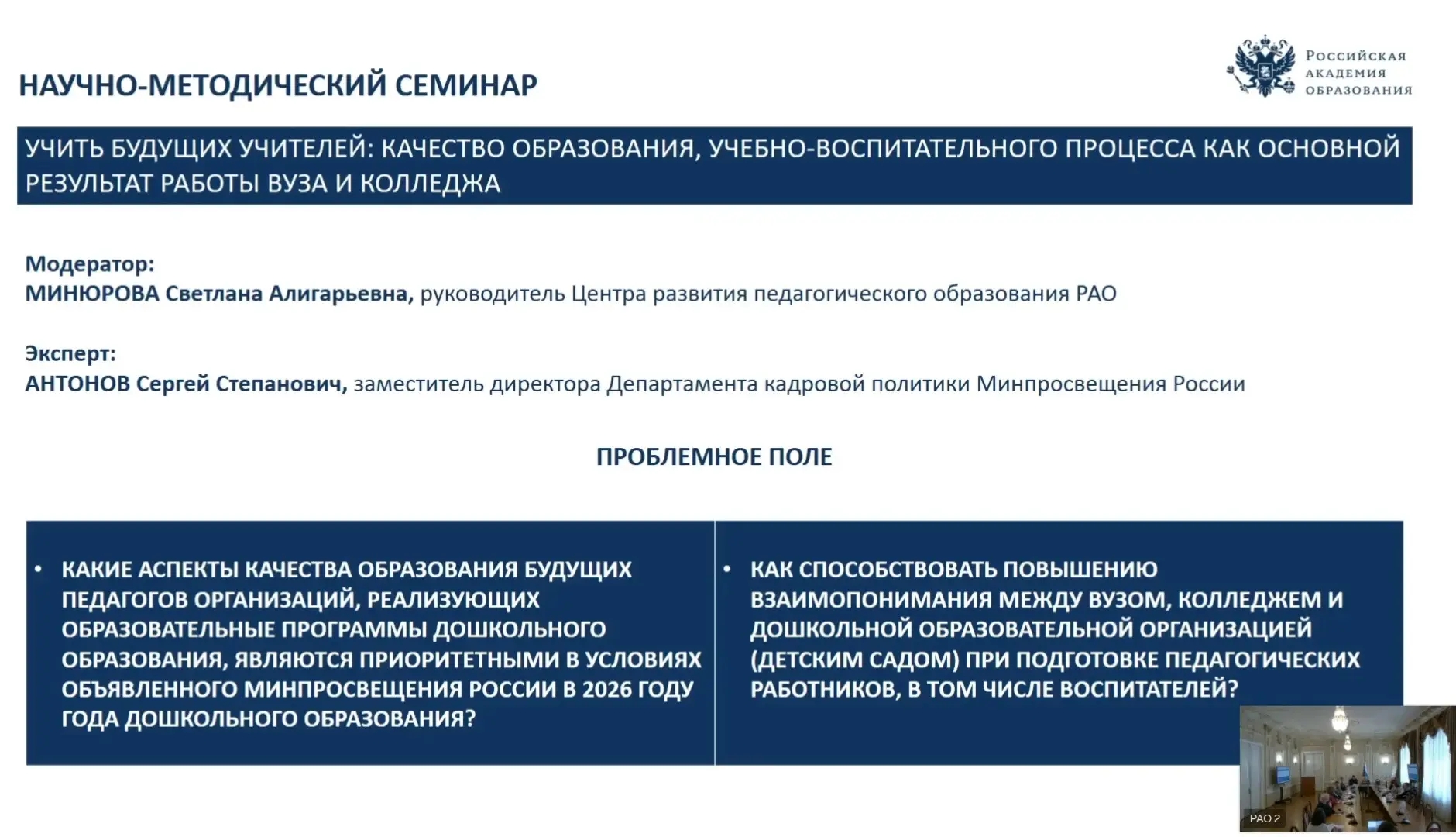 21 апреля в здании президиума РАО на Большой Полянке прошел научно-методический семинар «Учить будущих учителей: качество образования, учебно-воспитательного процесса как основной результат работы вуза и колледжа». Мероприятие организовано Центром развития педагогического образования Российской академии образования. Модератором научно-методического семинара выступил руководитель ЦРПО РАО, доктор психологических наук, профессор, член-корреспондент РАО Светлана Алигарьевна Минюрова.