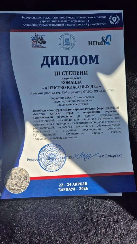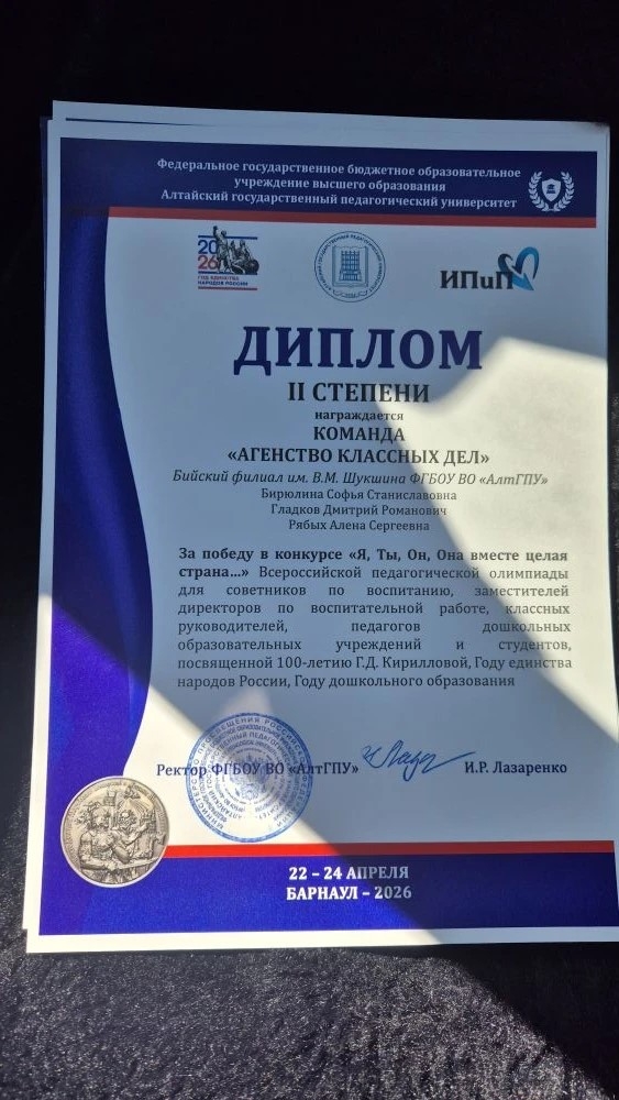 Команда студентов Университета Шукшина «Агентство классных дел» в составе Бирюлиной Софии (капитан), Гладкова Дмитрия, Рябых Алёны (под руководством доцента кафедры педагогики и психологии Н.В. Волковой) достойно представила наш вуз на Всероссийской педагогической олимпиаде для советников по воспитанию, педагогов и студентов, посвящённой 100-летию Г.Д. Кирилловой, году единства народов России (АлтГПУ, Барнаул). Диплом II степени вручили команде за победу в конкурсе «Я, Ты, Он, Она – вместе целая страна…»
